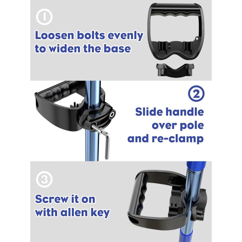 - Add On & Take Off Easily - The hex key attached to the handle can not only help you mount the grip to any stick tools in 1 min, but also make it hold steadier. And just loosen 2 screws, you can easily move the ergonomic grip from one tool to another.