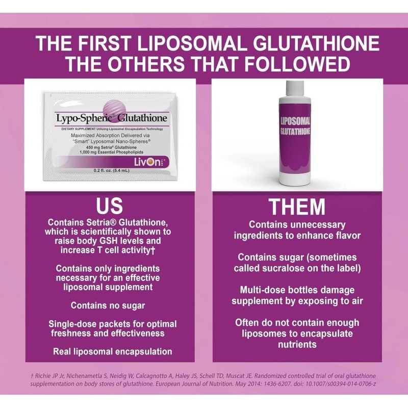 - Actively supports a healthy liver and the natural detoxification process within the body. No precursor supplementation necessary. Liposomes maximize absorption of active Glutathione.*