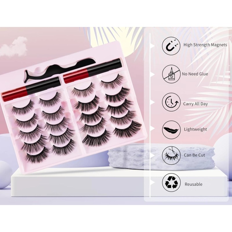 Branded Magnetic Eyelashes Kit 10 Pairs with Eyeliner & Tweezers Reusable Natural 3D