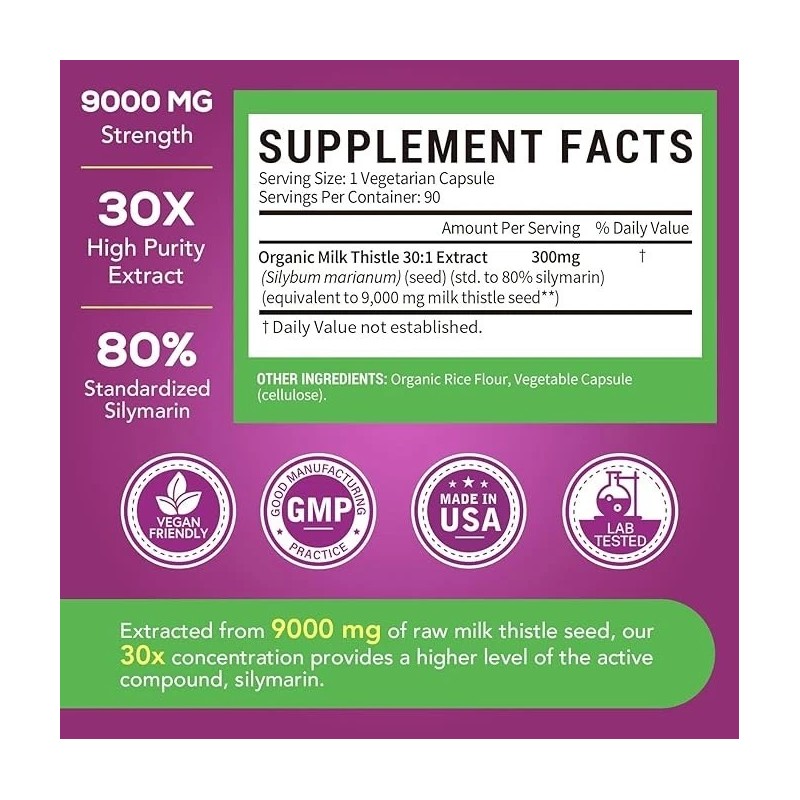 Branded Organic Milk Thistle, 9000 mg Equivalent, 30X Concentrated Seed Extract, 80% Sil