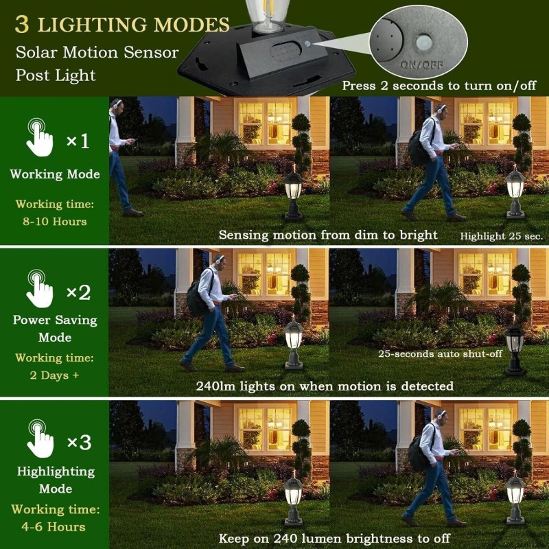 【3 Lighting Modes】The solar post lantern has 3 lighting modes you can set which come on automatically. three modes to select from: Mode①dim to bright upon motion detection(lasts almost all night). Mode ②bright light always on, no motion detection(don’t last nearly as long).Mode ③no light to bright light upon motion detection. You need to press the "ON/OFF" button for 2 seconds to turn on/off the outdoor lamp post light and press the button to switch the light mode
