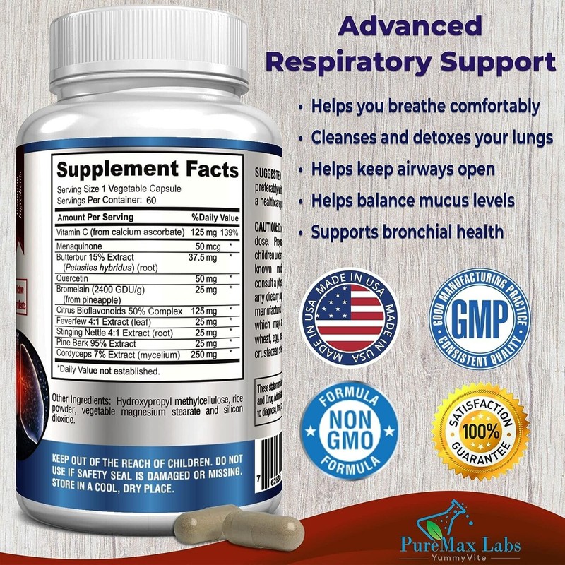 - SEASONAL ALLERGY SUPPORT: PureMax Labs' lung health supplement can also help with seasonal allergies. Our advanced respiratory support formula helps support the immune system of your lungs, helps balance mucus levels, and helps clear airways so you can better handle exposure to allergens.