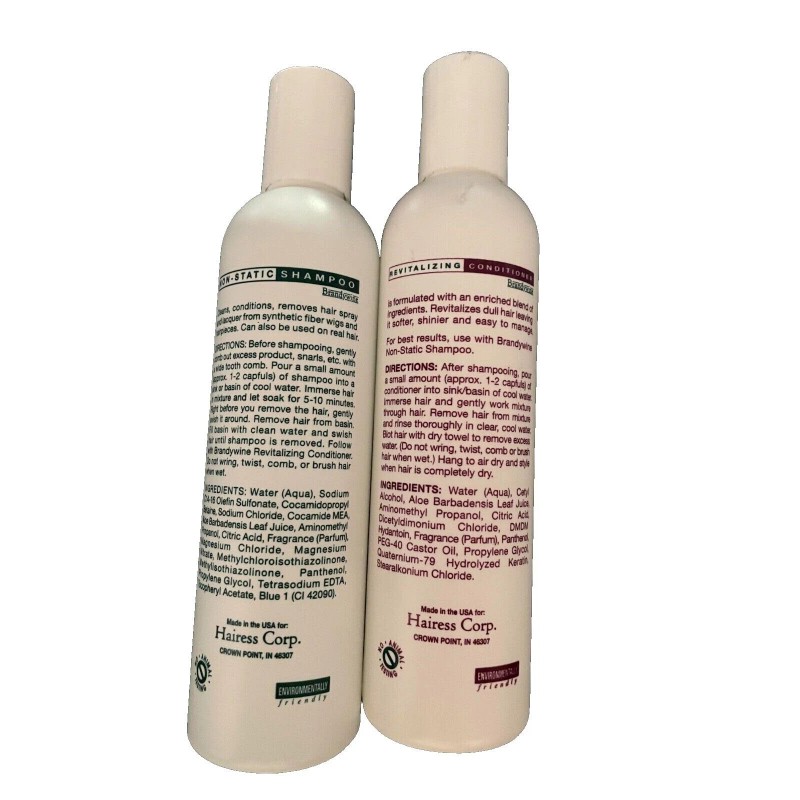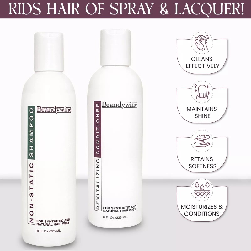 Best Value for the dollar! Brandywine Non -Static Shampoo and Conditioner cleans, conditions, removes hair spray and lacquer from Synthetic Fiber wigs and hairpieces. Can also be used on real/human hair.