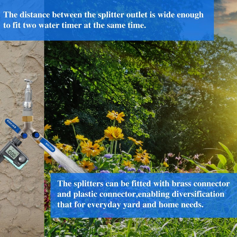 - 【Adapted to standard interfaces】Inlet is GHT 3/4-inch female thread, 2-way outlet is GHT 3/4-inch male thread, compatible with any North American standard 3/4-inch faucet, garden hose fitting, watering fixture, and maintains long term stable operation and water tightness.