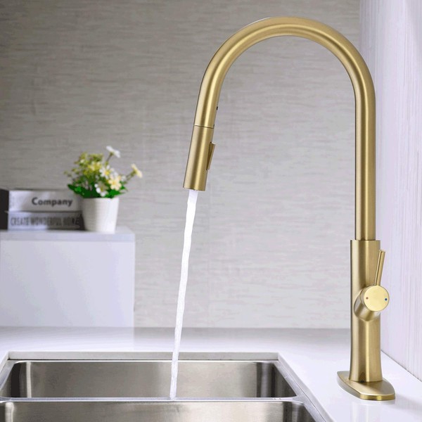 Brass Gold Kitchen Faucet with Pull Down Sprayer, Single Handle, 2-Way Pull Out Sprayer, 10-inch Deck Plate, Matte Brushed Gold, TRUSTMI KPF-1322MG
