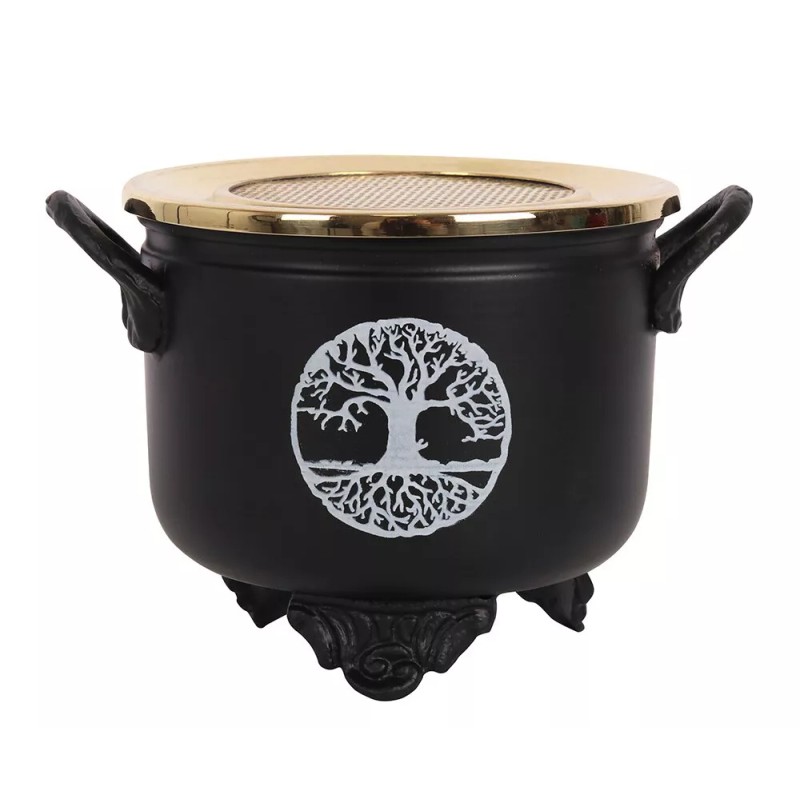 • Features a gold Tree of Life design and a grated brass tray for placing resin and herbs. Copper with a matte black finish.