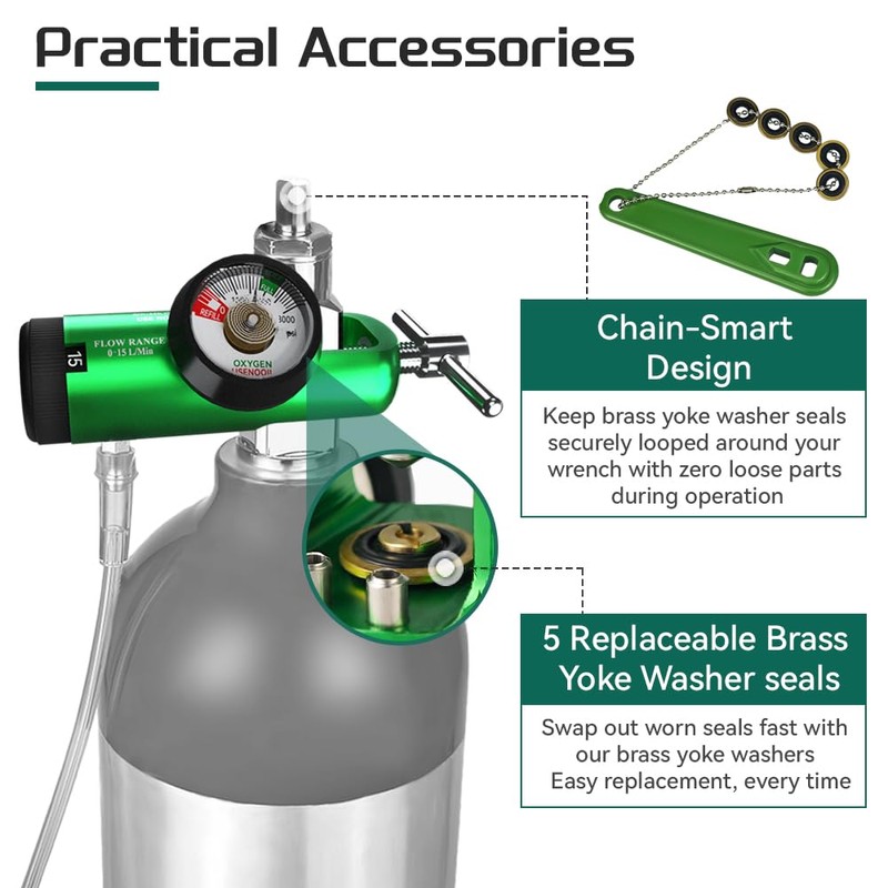 - Each Includes: 1×Mini CGA 870 Brass Integral 50 PSI O2 Regulator, 1×Cylinder Valve Wrench, 5×Yoke Washer seals, 1×Manual.