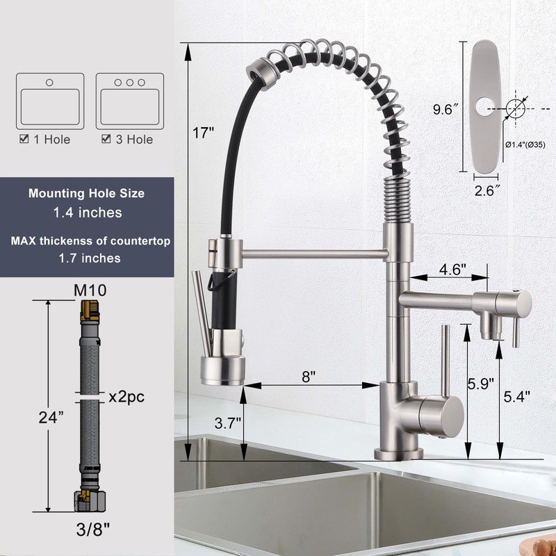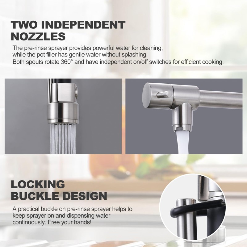 - 【Two Independent Spouts】The pot filler spout provides smooth water for filling pots in minutes, while the pre-rinse sprayer offers a high-pressure water flow to flush away food residue. It can be kept open with the top buckle to free up your hands. Both spouts rotate 360° and have independent on/off switches for efficient cooking