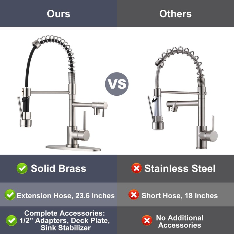 - 【Solid Brass kitchen Faucet】Made of high quality solid brass material, weighing 6.8 lbs, it prevents corrosion and rust, increasing the durability and reliability of the structure. Modern in a brushed nickel finish, it is fingerprint and stain resistant, suitable for creating a variety of kitchen decor styles