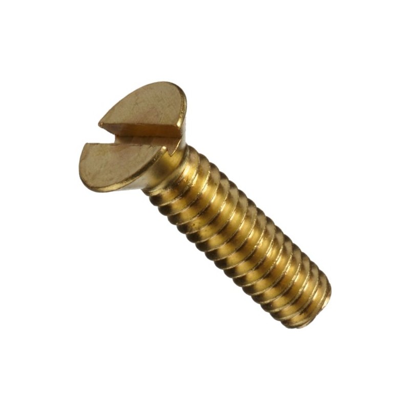 The brass machine screw has a plain finish and a flat head with a slotted drive. Brass provides corrosion resistance and offers thermal and electrical conductivity. The material is nonmagnetic. The slotted drive has a linear slot for use with a flat-blade driver. The flat head is cone shaped for use in countersunk holes and has a flat top that fits flush with the mated surface.