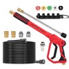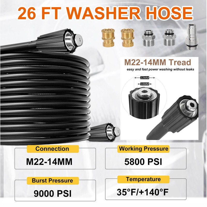- 【Package Include】1 x High Pressure Spary Gun;1 x Pressure Washer Hose,2 x Extension Wand ,1 x M22-15mm Fitting; 1 x M22-14mm Fitting;1 x 3/8" Quick Connect Fitting;5 x Spray Nozzle Tips