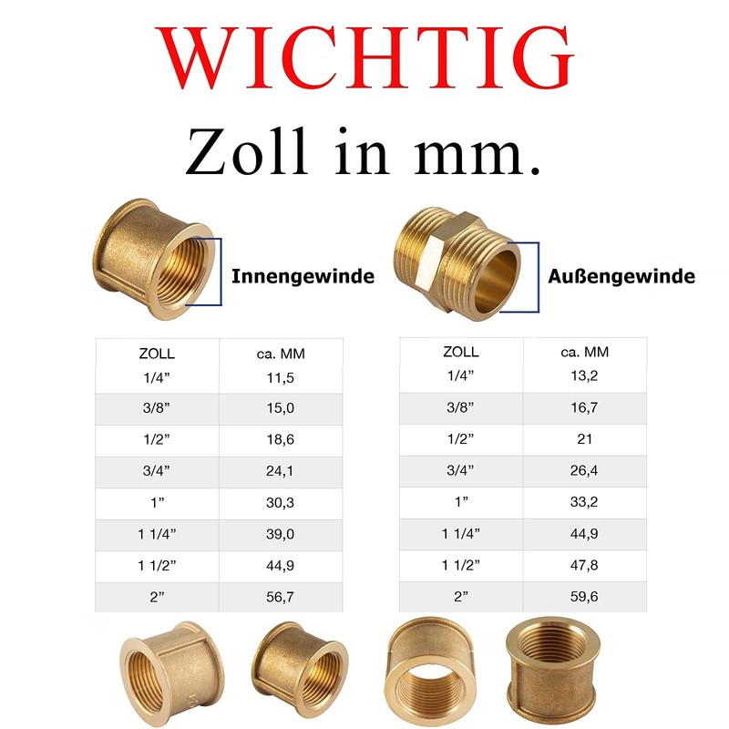 - Double sleeve with female thread/female thread: 7 different sizes available: 3/8 inch, 22 x 23 x 23 mm, 1/2 inch, 26 x 30 x 30 mm, 3/4 inch, 28 x 35 x 35 mm, 1 inch, 32 x 44 x 44 mm, 1 1/4 inch, 36 x 54 x 54 mm, 1 1/2 inch, 40 x 59 x 59 mm, 2 inches 44 x 71 x 71 mm.