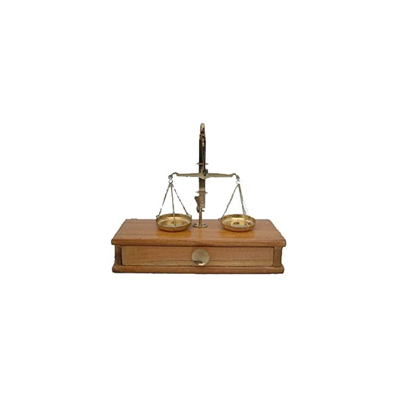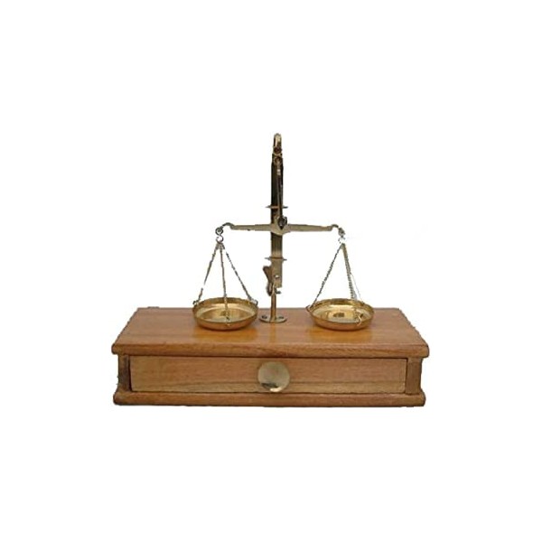 brass weighing scales 50gram wooden box with draw for weights