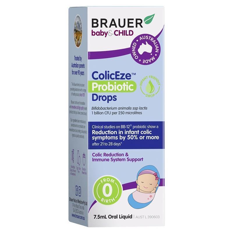 Probiotics are beneficial microorganisms that occur in the gut. Brauer's ColicEze™ Probiotic Drops contains the clinically researched strain of probiotic Bifidobacterium animalis ssp lactis, BB-12®. This probiotic strain has been shown to reduce Colic symptoms by 50% or more after 21-28 days in healthy breastfed infants. Probiotics also:• Support intestinal health