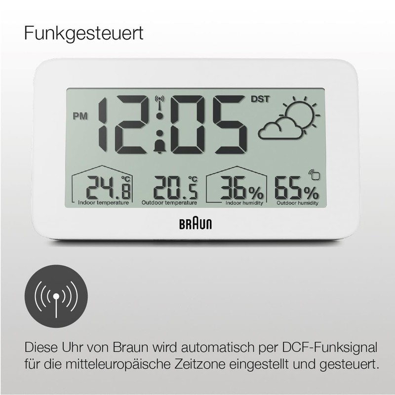 Design is at the heart of Braun - the concept of "less is more" has its origins in the Bauhaus movement, but it was Braun and Dieter Rams who created a concept of order, clarity and simplicity and applied to electrical appliances. For six decades, the humanistic design approach of Braun has inspired developers and companies around the world. Description: This Braun digital weather station clock has a positive LCD display and displays a forecast, indoor/outdoor temperature (Celsius or Fahrenheit) and humidity. It can also be set to a 12 or 24 hour mode. The continuous backlight function optimises readability in low light conditions and at night. This Braun weather station clock has a DCF radio signal function for the Central European time zone, which ensures absolute precision at all times. (In this way, most of Central and Western Europe is covered). In countries where the watch cannot detect the radio signal, the radio function can be disabled and the watch can be set manually. Dimensions: Clock: W 13.5 cm x H 7.5 cm x D 4.5 cm Sensor: W 6.2 cm x H 6.2 cm x D 2.6 cm Features: LCD display of indoor and outdoor temperature display (Celsius or Fahrenheit) Humidity display inside and outside Swelling alarm beep Integrated snooze/backlight functionBacklight illuminates when manually activated for 10 Secon seconds continuous Backlight that illuminates the display in low light conditions. 12/24 hour display. Outdoor sensor unit with LCD display (outdoor temperature and humidity). Additional information: Clock requires two AA batteries (not included). Sensor unit requires two AAA batteries (not included)