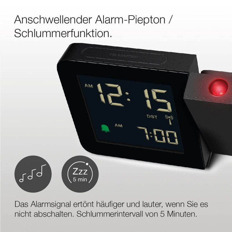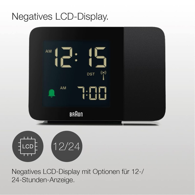 Braun Digital Radio Projection Alarm Clock for Central European Time Zone (DCF) with Negative LCD Display, Quick Setting and Alarm Beep in Black, Model BC15B-DCF