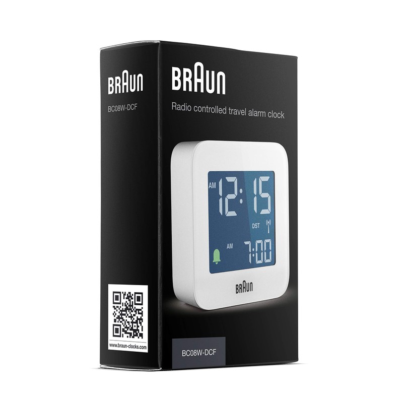 Braun Digitaler Reisewecker Mitteleuropäische Zeitzone (MEZ) mit Schlummerfunktion, kompakte Größe, Negatives LC-Display, Schnelleinstellfunktion, Crescendo-Alarm in Weiß, Modell BC08W-DCF.