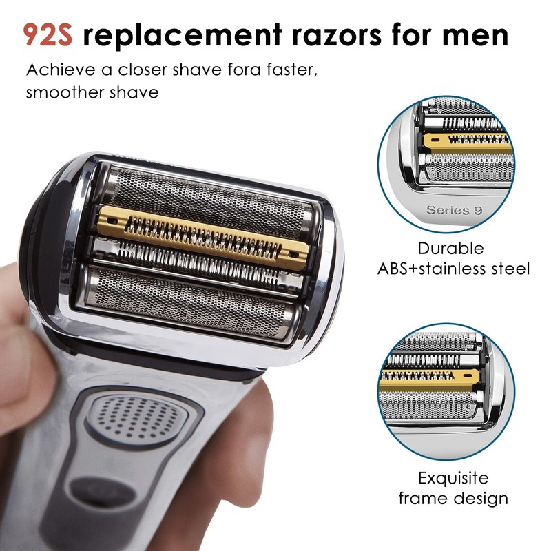 - 🧔🏻♂【PERFECT DESIGN】The mesh replacement head is equipped with a stainless steel mesh that adapts perfectly to your skin and works perfectly without hurting your skin. The 92S-series 9 shaving head is made of hypoallergenic gold foil with anti-collision technology. Shaving head series 9 is sharp, wear-resistant, durable, rust-resistant, waterproof, dustproof, protects sensitive skin and allows you to effectively and comfortably trim and shave hair on all parts of your face.