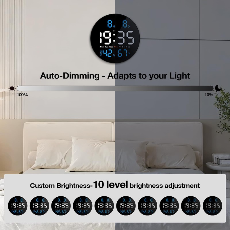 - 【Auto-Dimming & One-Touch DST】Smart brightness adapts to your room, ensuring it's never too bright at night. Also can switching to manual mode to choose from 10 brightness levels to suit your space. Switch Daylight Saving Time on or off instantly with a single button