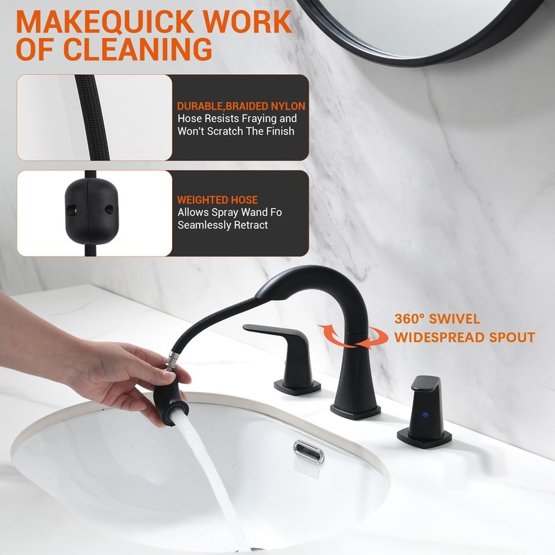 - 360 Swivel Widespread Spout: This BRAVEBAR matte black bathroom faucet can be rotated 360°, providing more space to clean your basin of every corner