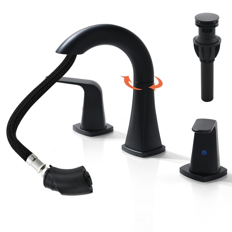 BRAVEBAR Pull Down Bathroom Faucet Black- Matte Black Sink Faucet with Sprayer, Bathroom Pull Out Faucets, 2-Handles Widespread Vanity Faucets 3 Hole 8 Inch 360 Swivel Spout with Pop-up Drain & Lines