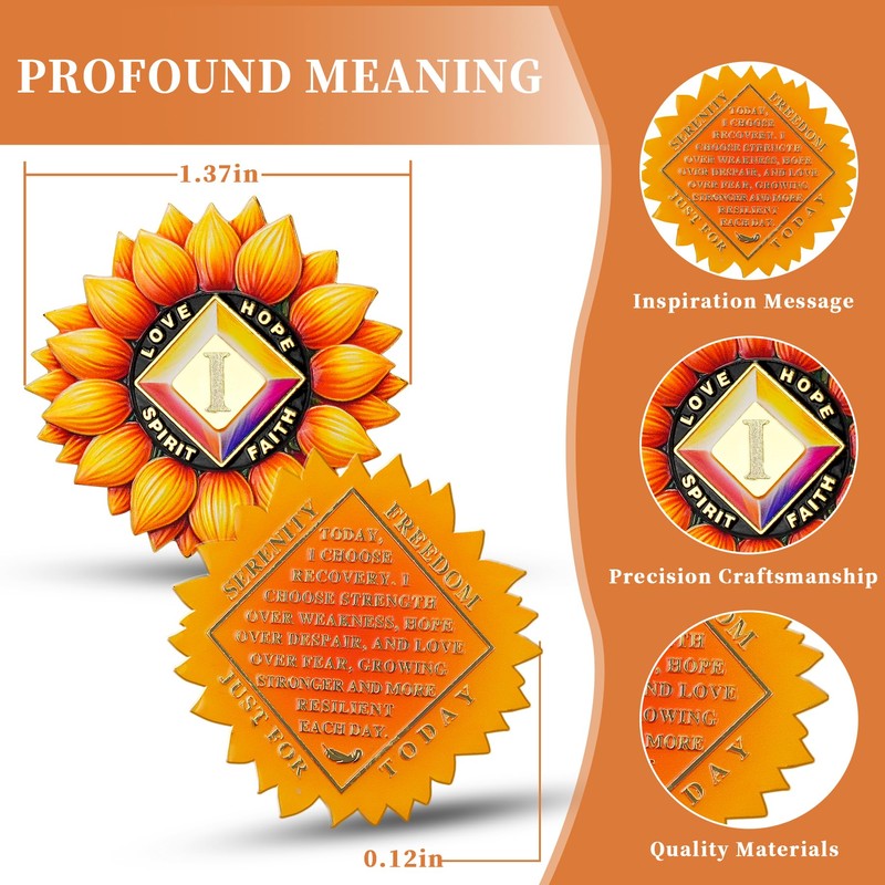 • Meaningful Symbolism for Recovery & Growth:The front of the aa coin features a radiant sunflower, symbolizing life, hope, and the pursuit of positivity. The diamond shape in the center represents inner strength and stability in your recovery process. Surrounding text, “Love, Hope, Spirit, Faith,” reinforces the core values of resilience and personal transformation