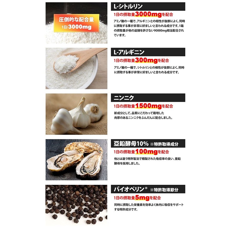 • 【国内トップクラスの配合量を実現】L-シトルリン・L-アルギニン・ニンニク・亜鉛・バイオペリン・イポルル・チュチュワシ・ウアナルポマチョ・クラボワスカ・パフィア・マカ・ガラナを筆頭に全66種類の成分を絶妙なバランスで配合!! 私達は、100種類や200種類入ってるような、見せかけだけのクズ成分の寄せ集めは決してしません。