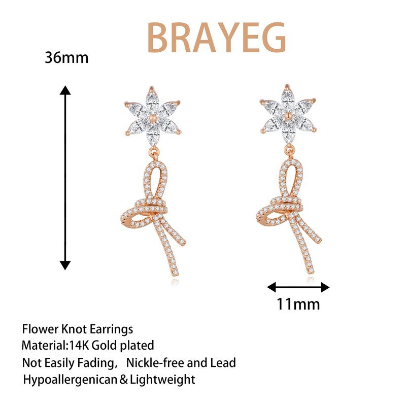 - Flower Earrings: hypoallergenic earrings made of brass with 18k gold plated finish. The material is safe for more people Hand-set delicate zirconia stones give the flower knot earrings a textured look.