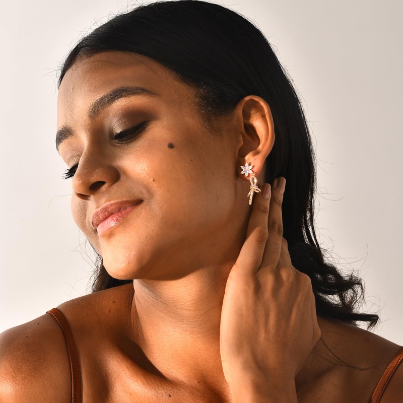 - DESIGN: Small delicate knots dangle from gold coloured floral stud earrings. Perfect for everyday wear, these tiny diamond encrusted floral earrings will add a chic touch to your everyday look.