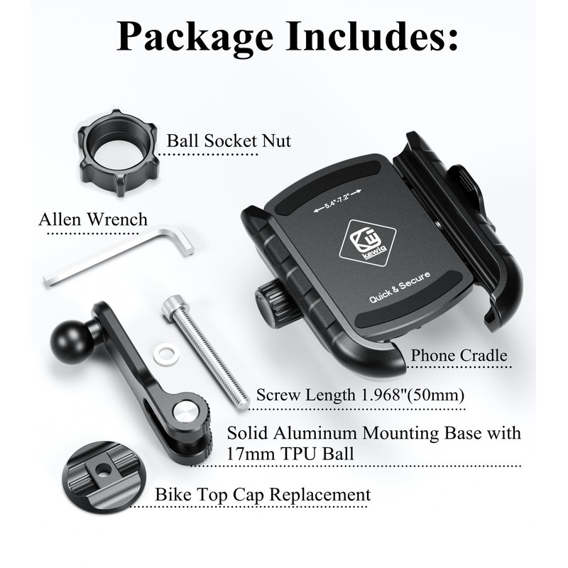 • Sturdy & Secure: The main body of this bike phone mount is made of PA66+GF30% high-strength material, phone cradle with aluminum alloy panel and adopt solid aluminum mounting base. Set comes with aluminum alloy headset top cap replacement and stainless steel bolt. The all-around rubber pads on phone clip protect your phone from scratching and slipping