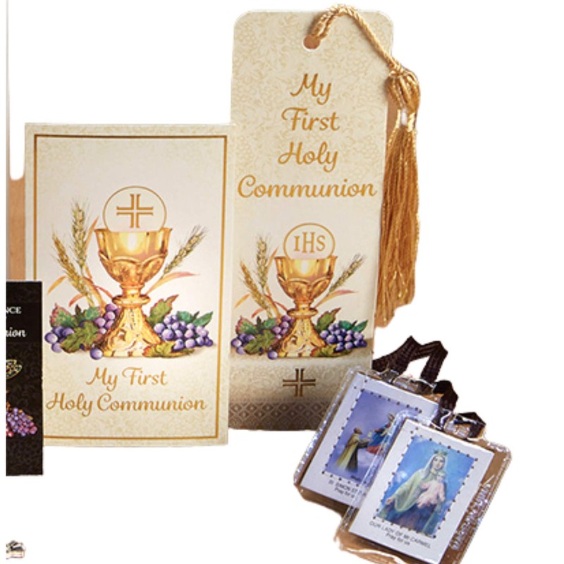 - Set includes mass book, scapular, rosary, lapel pin, bookmark, holy card and candle