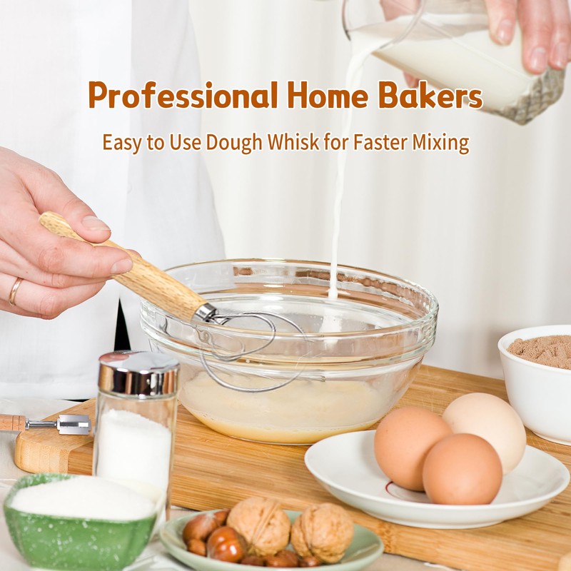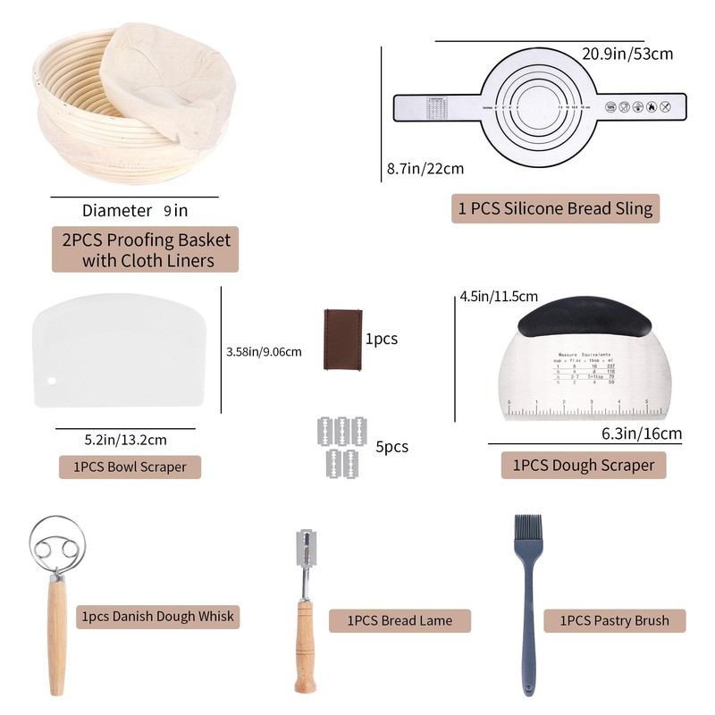 • Sourdough Bread Starter Kit:A complete bread making kit which includes all essential tools you need for proofing: 2pcs of Bread Proofing Baskets with high-quality linen cloth liners, Silicone Bread Sling, Dough Scraper, Bread Lame with 5 Extra Blades, Silicone Pastry Brush, Danish Dough Whisk, Bowl Scraper. Bread-making is so much easier when you have the best & right tools. No more mess