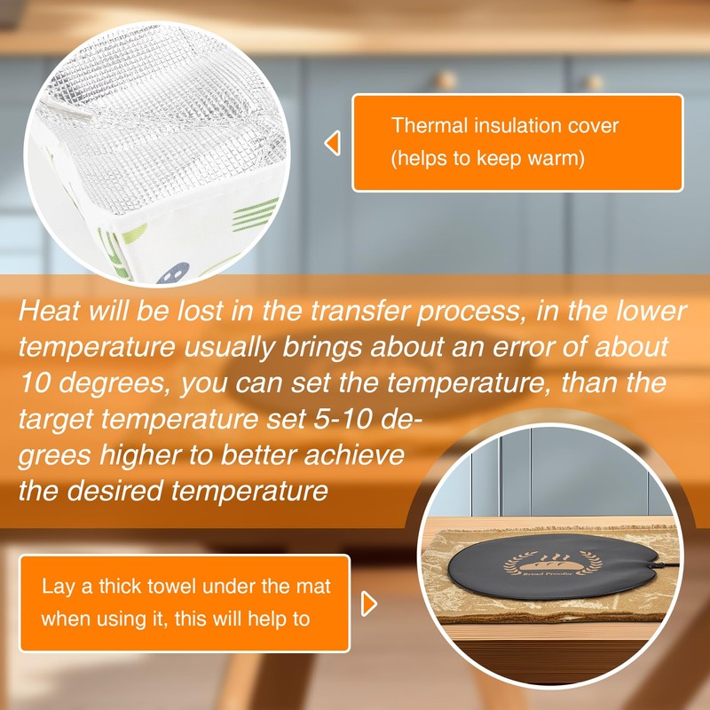 BREAD WARMING MAT: Bread warming mat can not only ferment dough, but also help to ferment meat, ferment yogurt or some fruits and wines that need to be fermented, as well as other foods and items that need to be kept warm, such as cookies, fried chicken and so on. As the default temperature is 89℉, which is lower than the human body temperature, please note that you need to set a higher temperature to achieve the heat preservation effect when using the heat preservation function
