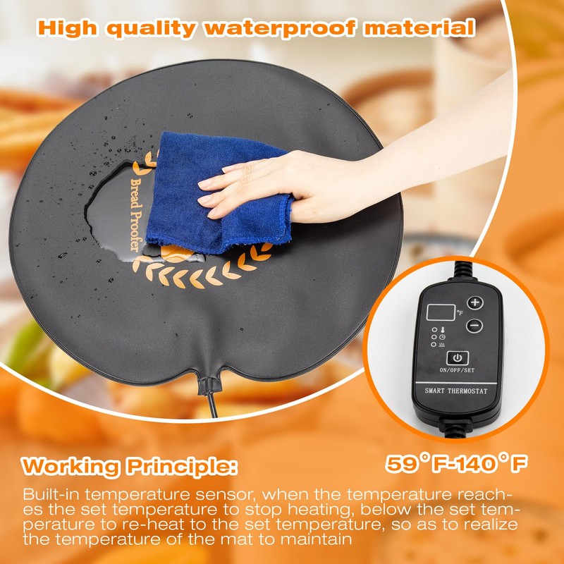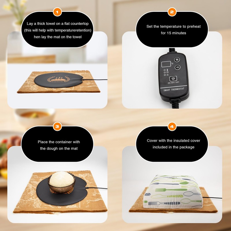 - EASY TO USE BREAD PROOFING MAT: First, lay a thick towel on the table and place the proofing mat flat on the towel. Then, turn on the controller and preheat for 15 minutes. Then, place the dough bowl on the mat. Finally, cover the dough with the insulated lid. The towel is there to help keep the heat in and encourage a quicker reaching of the set temperature