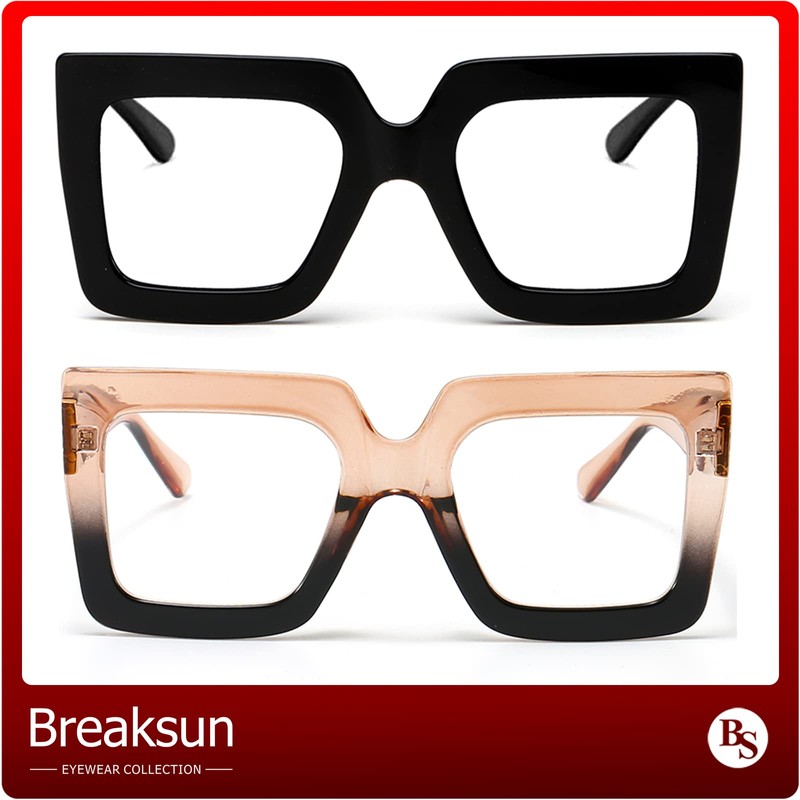 Breaksun anteojos de luz azul de gran tamaño para mujer, anteojos gruesas cuadradas para computadora, sin receta, anteojos negras, Paquete de 2 (negro + negro champaña), MM