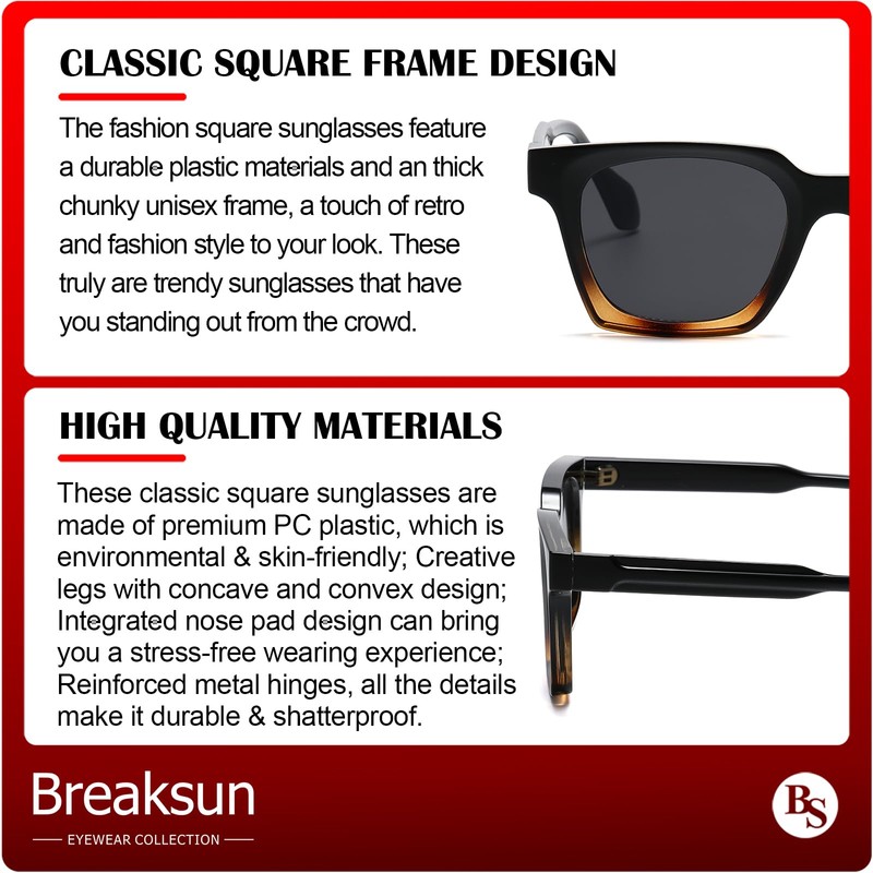 - CLASSIC SQUARE FRAME DESIGN : The fashion square sunglasses feature a durable plastic materials and an thick chunky unisex frame, a touch of retro and fashion style to your look. These truly are trendy sunglasses that have you standing out from the crowd.