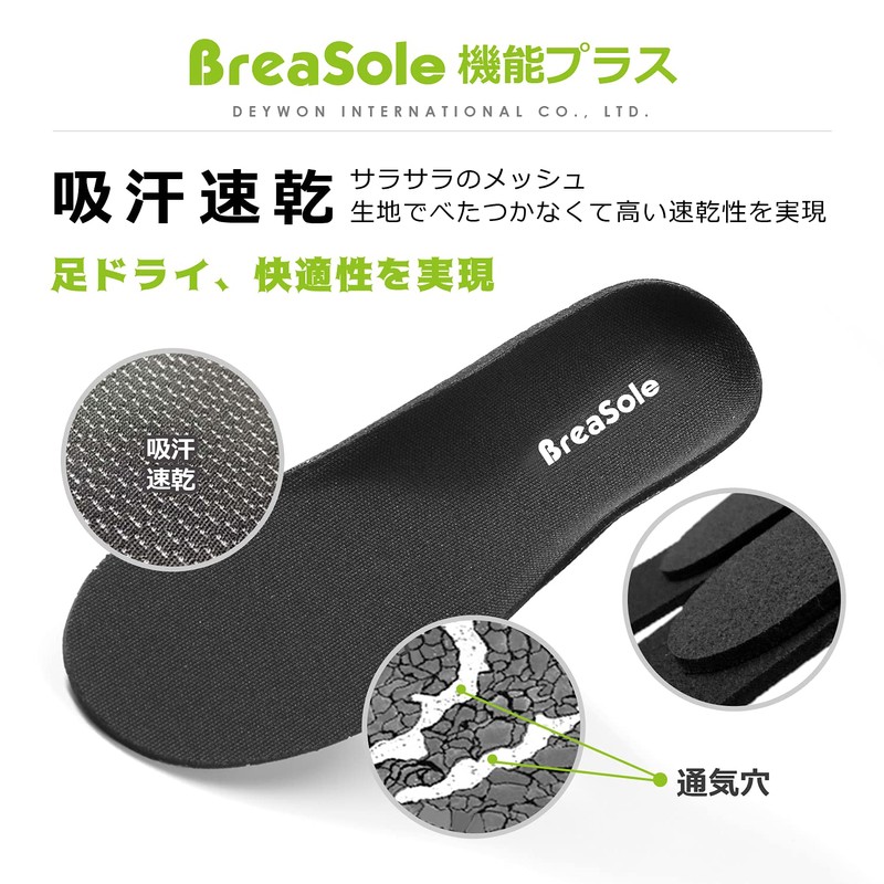 Why BreaSole (Brasole)? A powerful deodorizing and anti-bacterial effect that has never been seen before; Innovative construction allows you to experience a new feeling of comfort; Ventilation material with no other materials increases shock absorption and reduces impact on the soles of the feet, and can handle your body lack of physical conditions; Draws the original movement and stability of your feet, reduces the burden on your entire body and does not dent.