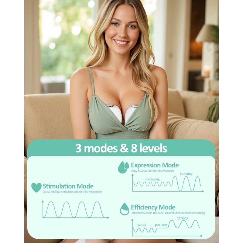 • ELECTRIC BREAST PUMP - 3 modes (stimulation, expression, mixed) and 8 levels of suction to naturally mimic your baby's feeding style, the rounded spiral ensures better suction and provides absolute comfort for mothers