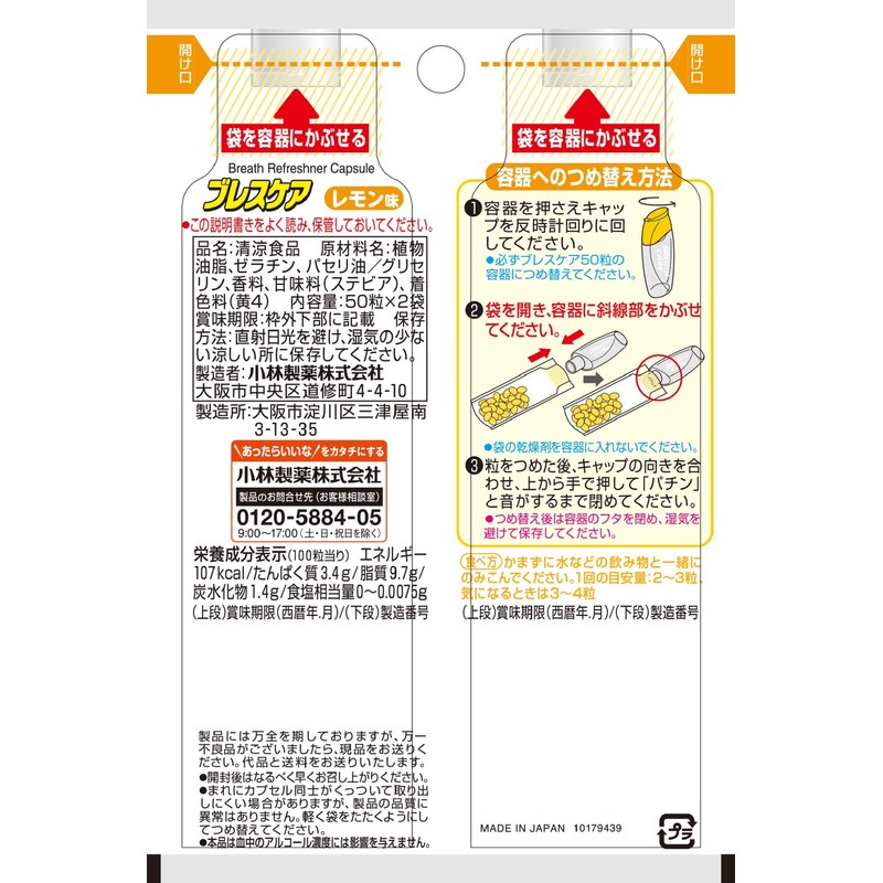 Breath Care Refreshing Capsules with Water, Refills, Lemon 100 Tablets (50 Tablets x 2 Packs)