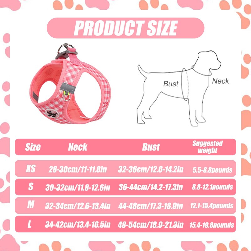 - 【Kind Tips】XS is suitable for pets with neck circumference of 28-30cm and chest circumference of 32-36cm; S is suitable for pets with neck circumference of 30-32cm and chest circumference of 36-44cm; M is suitable for pets with neck circumference of 32-34cm and chest circumference of 44-48cm; L is suitable for pets with neck circumference of 34-42cm and chest circumference of 48-54cm. Do not buy based on past experience. Use a soft tape measure to measure the widest part of your pet's neck and chest before placing an order, leaving 2-3cm for the right size. If you are between two sizes, we recommend that you choose the larger size. Do not choose a size based on weight alone.