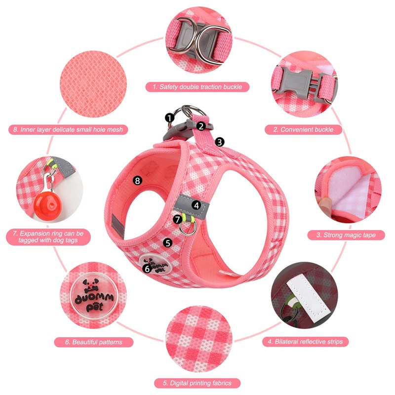 --The kitten vest adopts a breathable mesh design to increase breathability, reduce friction and avoid discomfort caused by long-term wearing. In addition, the small dog harness fits the dog's body shape 360°, evenly distributes force, avoids strangulation of the trachea and provides a better comfort experience.