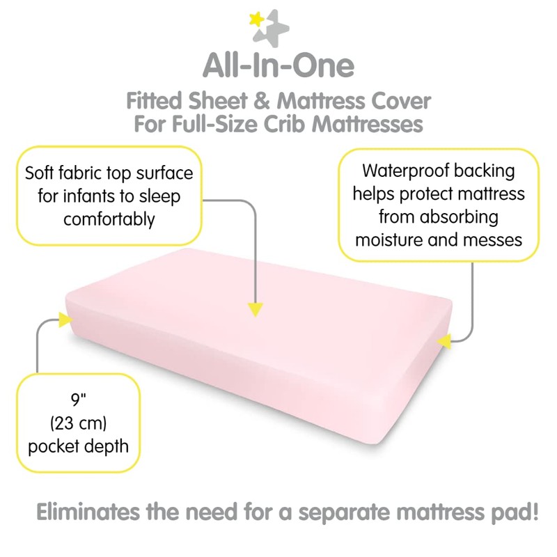 • · ALL-IN-ONE FITTED SHEET & MATTRESS COVER: Provides a soft fabric top surface for infants to sleep comfortably while the waterproof backing helps protect the mattress from absorbing moisture and messes. Eliminates the need for a mattress pad.