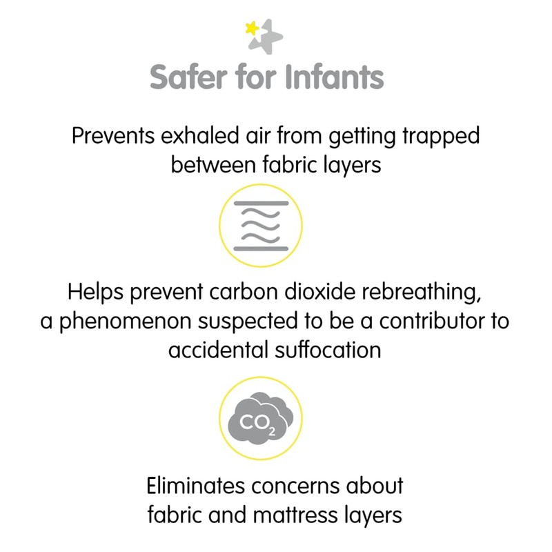 • · SAFER FOR INFANTS: Prevents exhaled air from getting trapped between fabric layers and helps prevent carbon dioxide rebreathing, a phenomenon suspected to be a contributor to accidental suffocation. Eliminates concerns about interaction of layers.