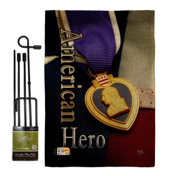 Breeze Decor GS108407-DB Purple Heart Hero Burlap Americana Military Veteran Decorative Gift Vertical 13" x 18.5" Double Sided Garden Flag Set Metal Pole Hardware Made in USA