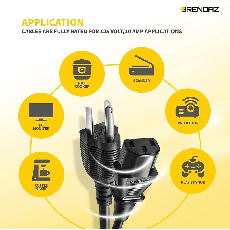 BRENDAZ Universal PC Power Cord - 3 Prong AC Power Cable Replacement for Computer, Monitor, Scanner, Printer - IEC 320 C13 to NEMA 5-15P, 18awg, 125V 10 Amp (6-FEET)