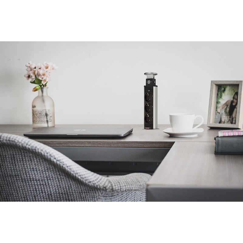 - Innovative fixed installation table socket for flexible workplace design - retractable in the table top, discreetly inserts in the table surface