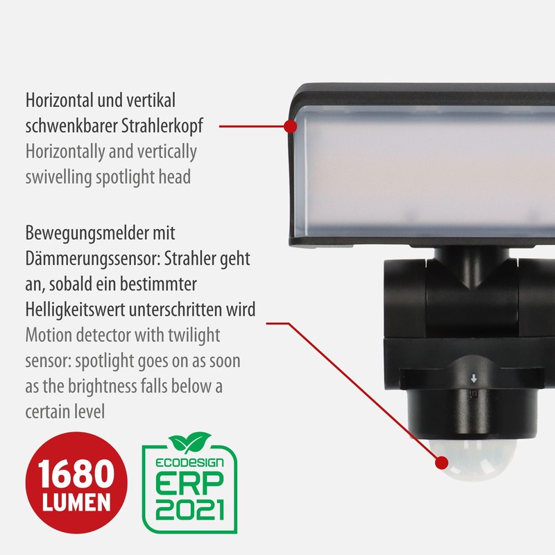 Brennenstuhl WS 2050 SP/LED Outdoor Spotlight with Motion Sensor 20 W (1680 lm, IP44, 3000 K, Warm White Light, 180° Detection Angle with up to 10 m Range, with Twilight Sensor) Black