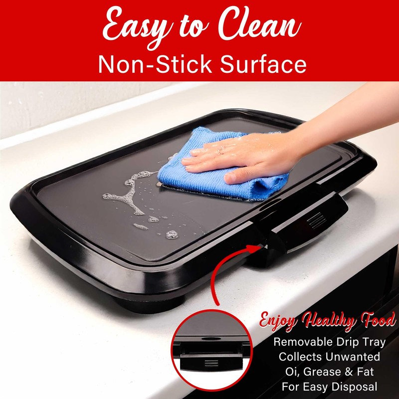 - HEALTHY & EASY TO CLEAN – Feel good as unwanted fat and oil drips away while cooking leaving leaner, healthier portions of food. Clean up has never been easier between wiping down a flat non-stick cooking surface and emptying the removable drip tray.