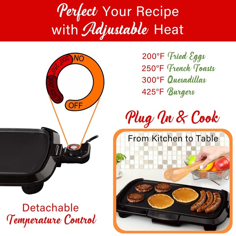 - ADJUSTABLE TEMPERATURE – Cook with precision using the fully adjustable thermostat. Use high heat to sear steaks and brown chicken. Use low to medium heat for eggs, bacon, and more. You’re in complete control.