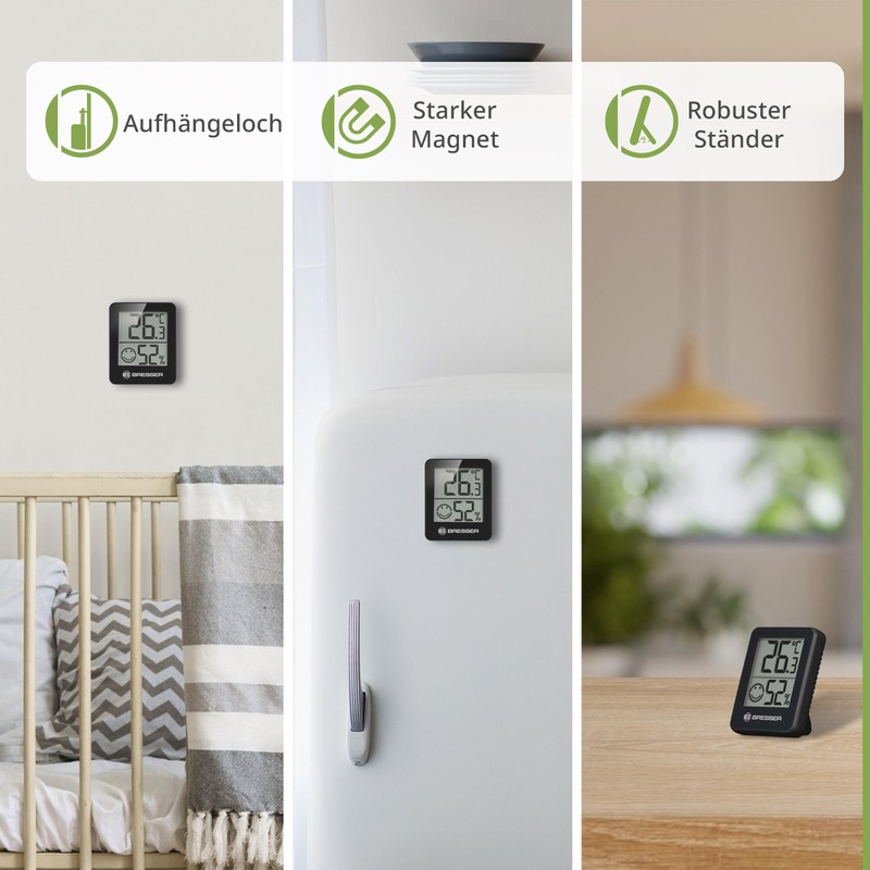 • With this practical set of 6, you can monitor the climate in several rooms and thus protect against excessive moisture build-up